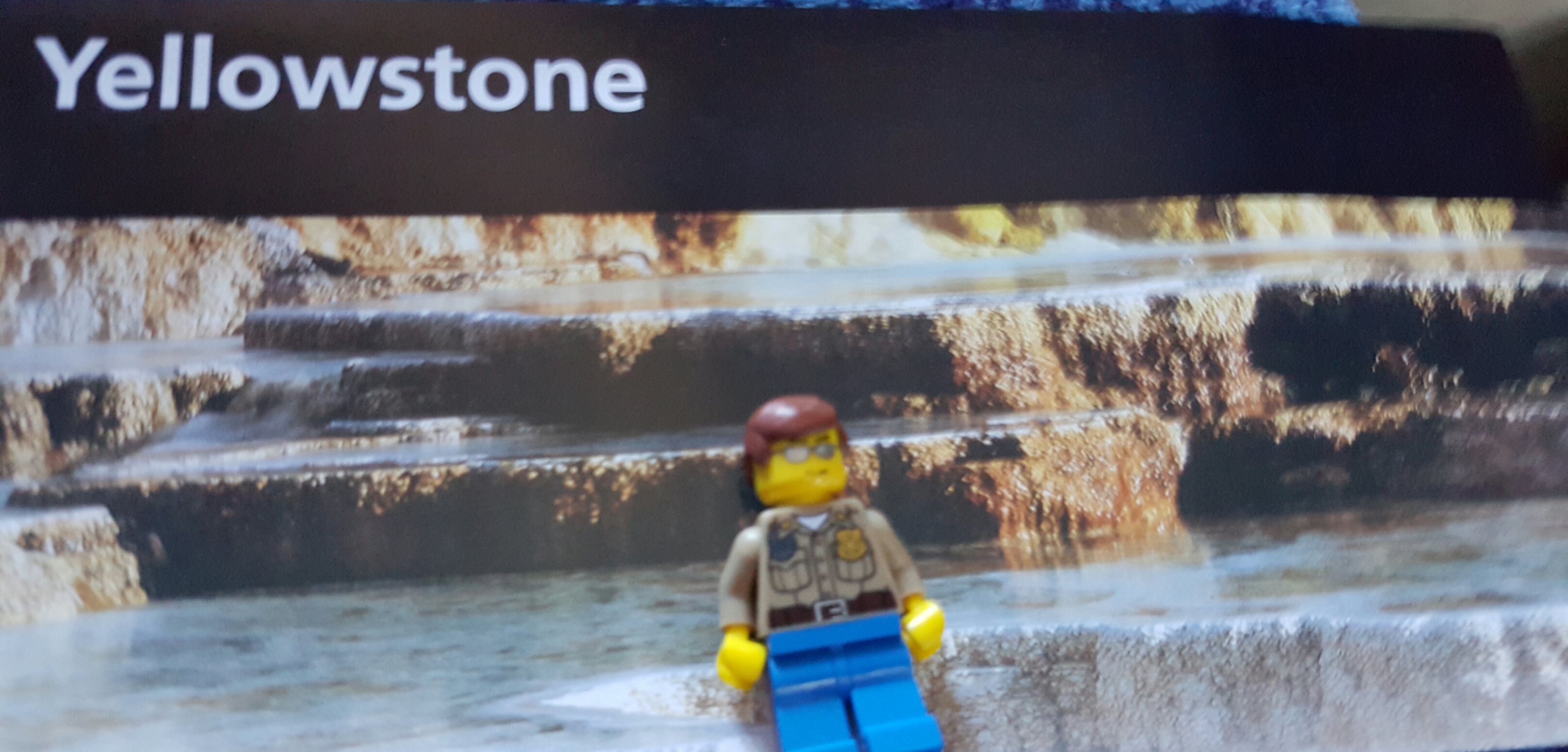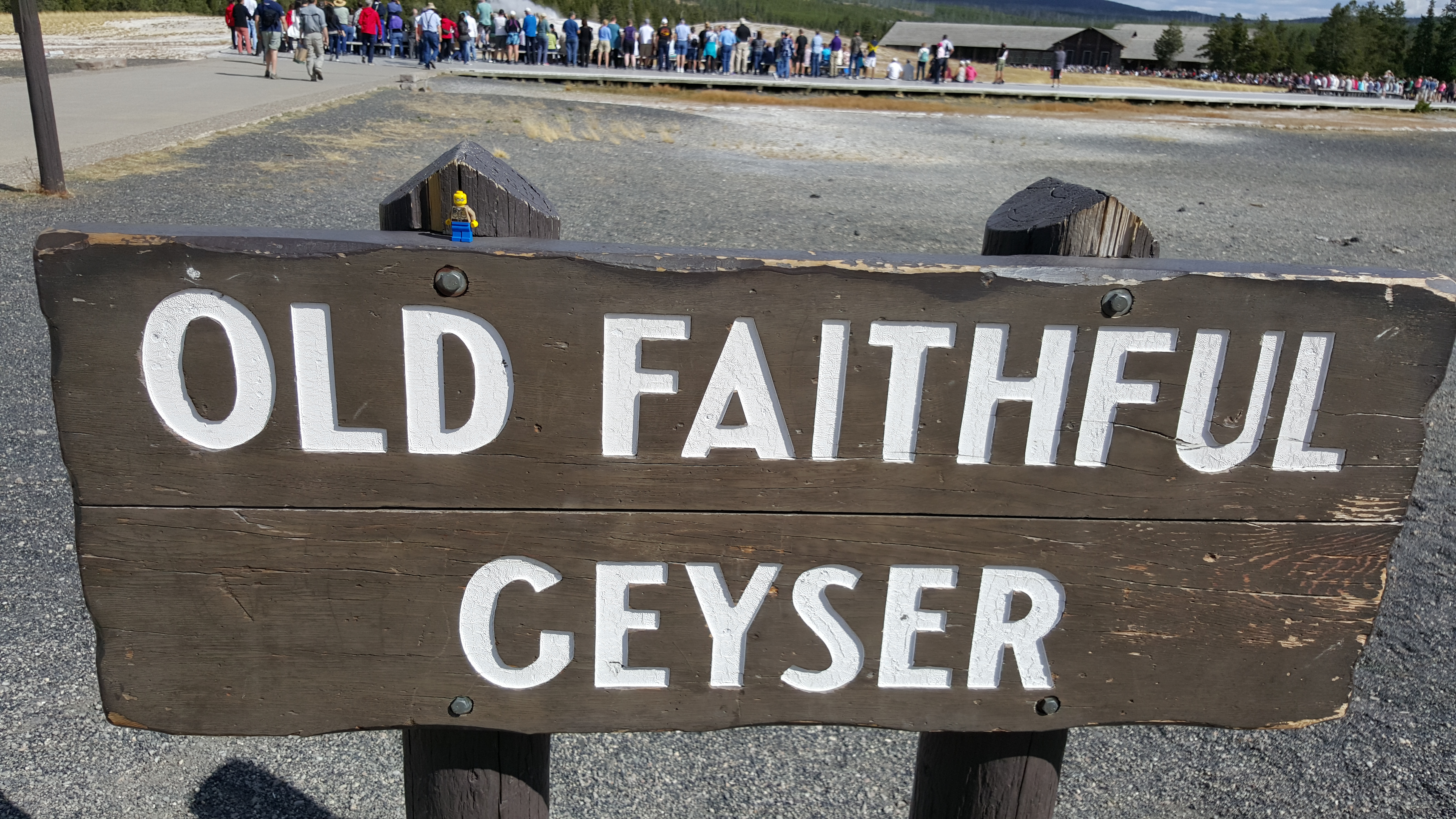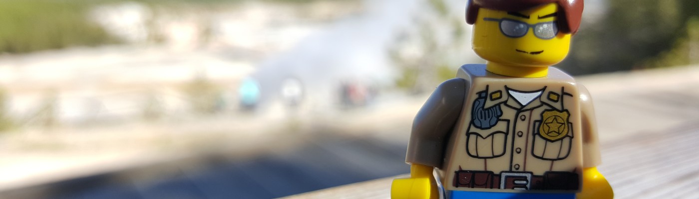 Pero bueno, regresemos a la aventura de los Legos. Todos los visitantes quieren tomarse fotos en el letrero de «bienvenido a Yellowstone» y había un poco de viento. Atrasé a los turistas porque yo quería tomar la foto de los compañeritos y se caían con el aire. Pero ya una vez que lo logré, todos se tranquilizaron