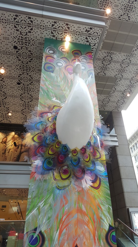 Y otro aspecto sorprendente de Hong Kong y la cultura China es la importancia de algunos símbolos y animales. El pavorreal es una representación del ave Fénix que es representativo de la Soberanía o independencia. De acuerdo a la leyenda, los pavorreales tienen 100 ojos y simbolizan la protección, la dignidad y la belleza, y la escultura colgada en el hotel donde me estaba quedando era imponente: