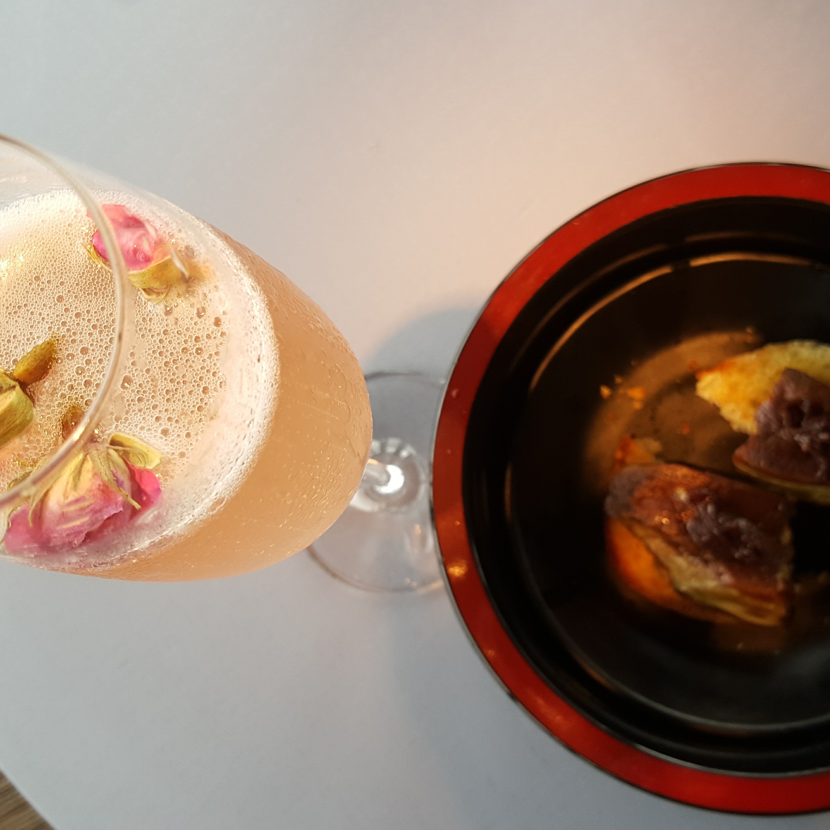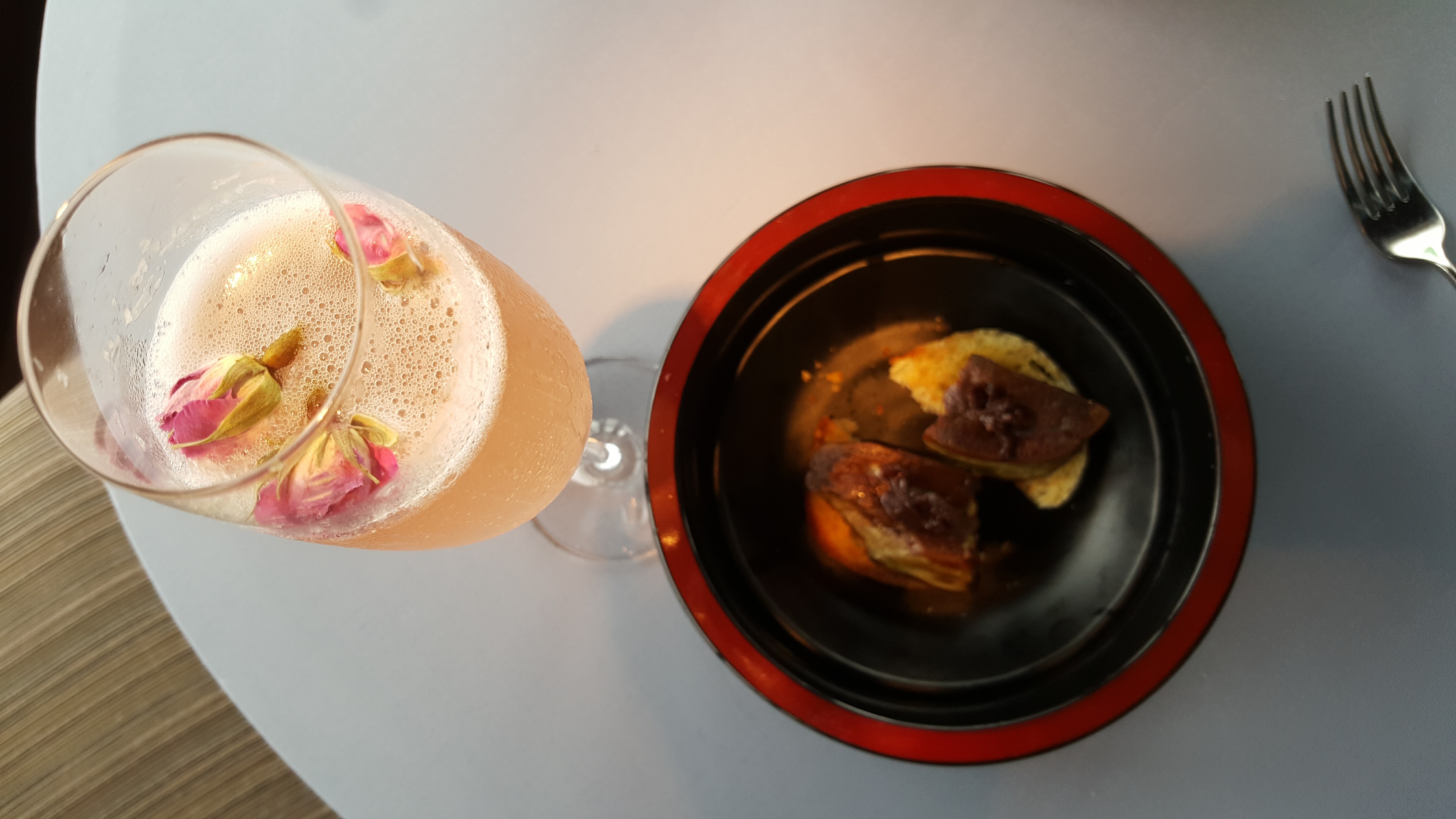 Bueno y como siempre, viajar representa una oportunidad para conocer nuevos sabores o disfrutar más las bebidas o platillos favoritos así que les dejo unas fotos de mis burbujitas en el avión y de algo que creo que no se me va a olvidar en mucho tiempo. Lo primero fue el hotel Peninsula donde estuve en una degustación de 13 tiempos con platillos muy exóticos. Lo padre de este hotel es que salió en una película de James Bond- The Man With The Golden Gun (y la mejor vista era la del baño de mujeres…donde está mi amiga Lego!!). Lo segundo fue en un restaurante del Ritz Carlton que tenía un festival de comida con flores y me comí la delicia máxima que fue un montadito de cebolla caramelizada con Foie Gras ( que es hígado de pato) sobre un pan recién tostado y acompañado de vino espumoso con esencia de rosas. Tal vez cuando estén leyendo esto no se les antoje pero les prometo, chiquitines, que cuando sean grandes se los prepararé y llorarán de la delicia. ¡Algún día!