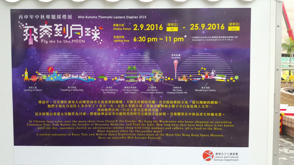 Cada vez que uno viaja a Asia puede haber una celebración diferente- y muy importante. Por la fecha en que viajé en Septiembre, se celebra el inicio del Mid-Atumn Festival o el festival de mediados de Otoño que tiene como principal protagonista a la Luna. Le dicen Moonlight Festival y es como la bienvenida del Otoño donde dan ofrendas de fruta y vino, hacen los famosos «mooncakes» a la diosa de la luna para que bendiga la cosecha o cumpla deseos de amor. Hay linternas de papel que lanzan al cielo y cada año hay un tema. Este año fue de una leyenda de los conejos y otros animales que eran los guardianes de la luna que se encontraron con los humanos, como para hacer un homenaje a los avances de la ciencia. Uno de los días que fui a corer me tocó ver cómo estaban preparando las linternas en los parques y el espectacular que contaba la historia. ¡Qué suerte porque pude tomarle foto para ustedes!