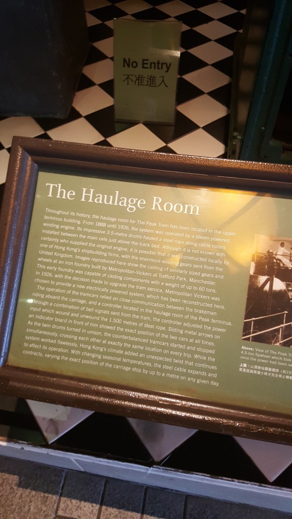 También pude ir al Funicular que te lleva a la cima del punto más alto de Hong Kong. Antes de que se modernizara, todo era manejado por medio de poleas (que pronto verán en la clase de física) y realmente subir tanto peso aceitar los engranes de manera correcta era un puesto muy importante en su momento. Pude tomar una foto del cuarto de máquinas hasta donde te dejaban entrar pero les dará una idea que cómo se veía.