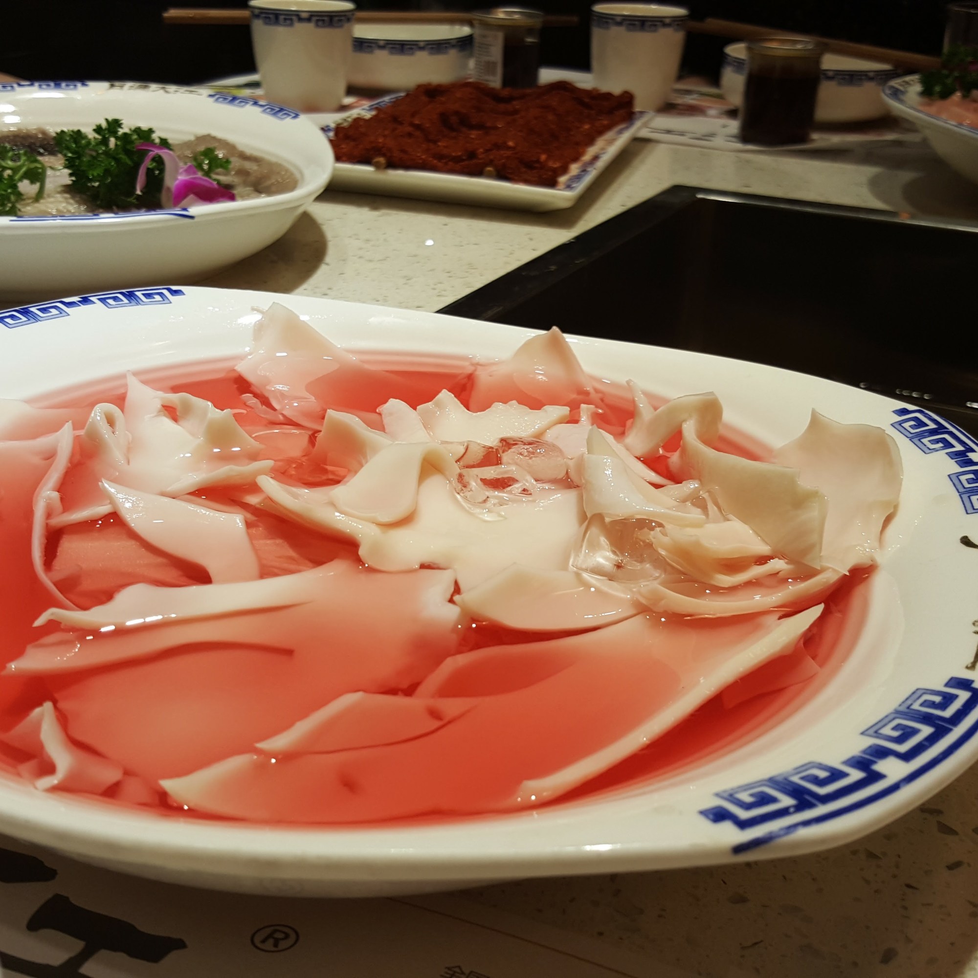 Número 1: El famoso HOTPOT. Este es un platillo típico de Sichuan y es como un caldo de aceite hirviendo preparado con el chile Sichuan que es una especia que te duerme la lengua. Puedes pedir ligero, medio o intenso y cuando llegas a los restaurantes, si es que te vas a atrever a pedir el Hot Pot intenso, te piden que te cambies tu blusa o camisa por una bata de toalla porque vas a sudar muchísimo. Como saben, a mi me encanta comer todo lo picante pero preferí ser moderada y pedí el mediano. FUE TREMENDO. Enseguida se me durmió la lengua, nos dieron varios tipos de carne de diferentes animales, res, conejo, pato para freír y te daban arroz blanco y trozos de bambú y otros vegetales para balancear la comida. Las tripas fueron lo más difícil de masticar.