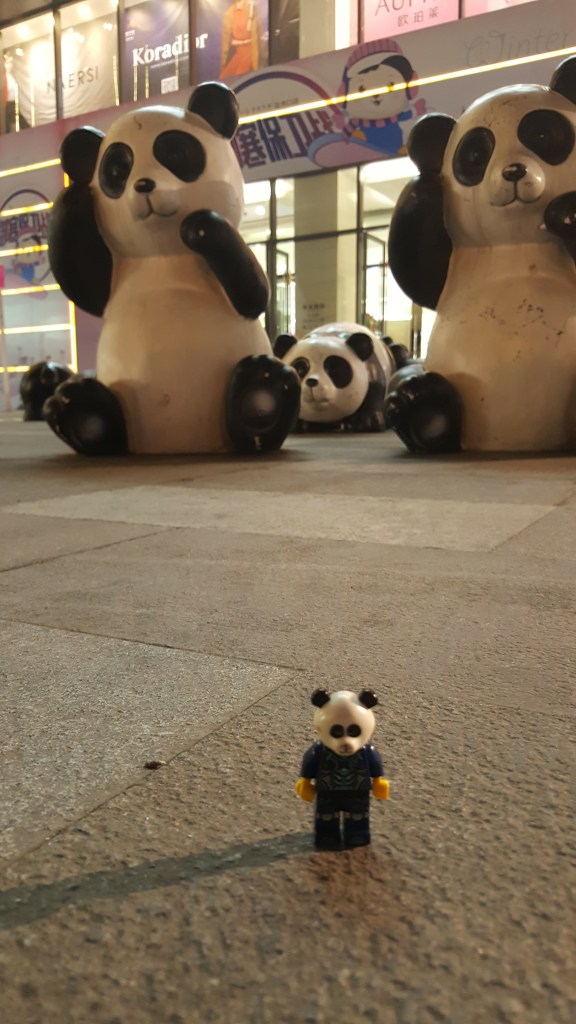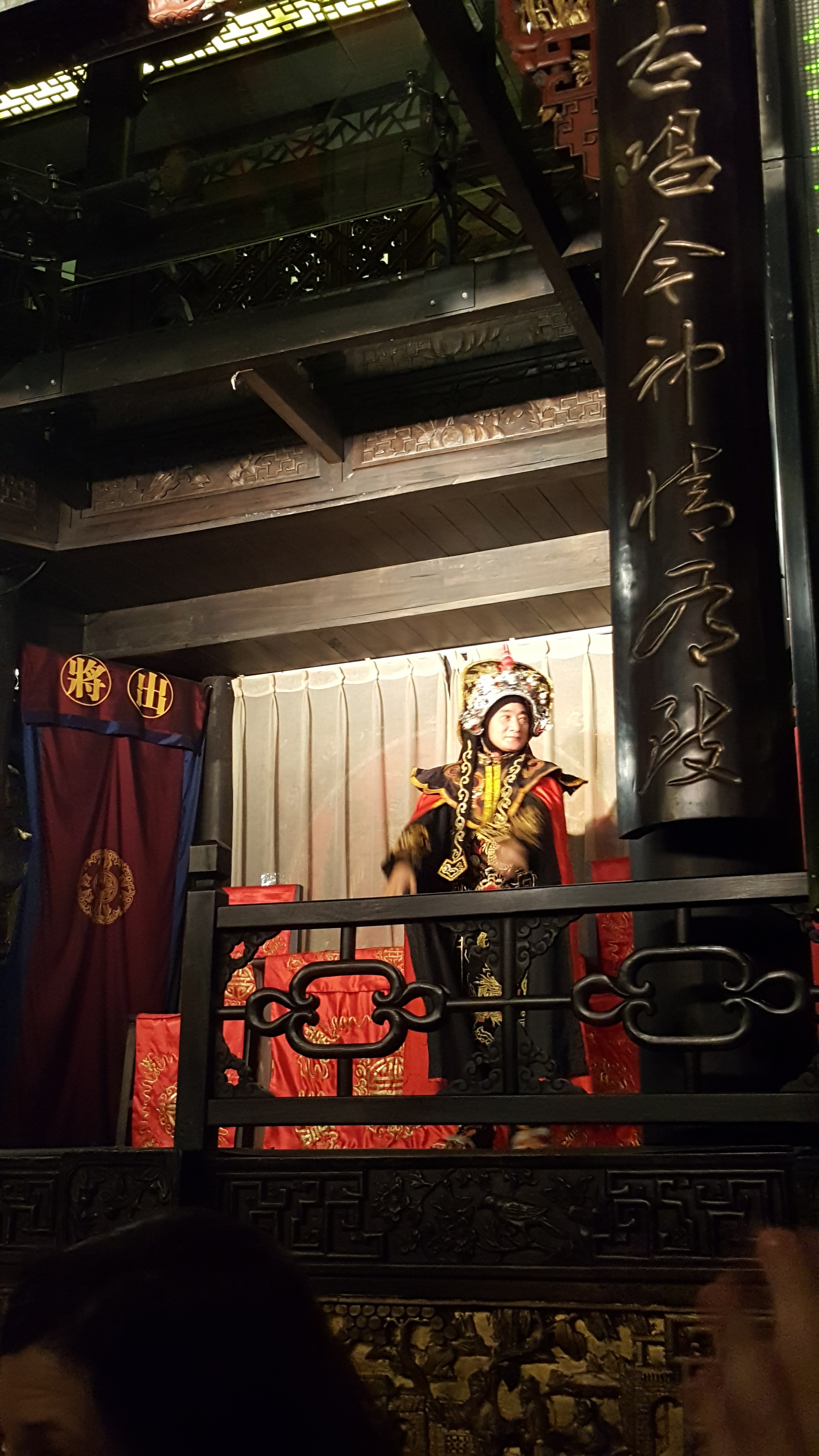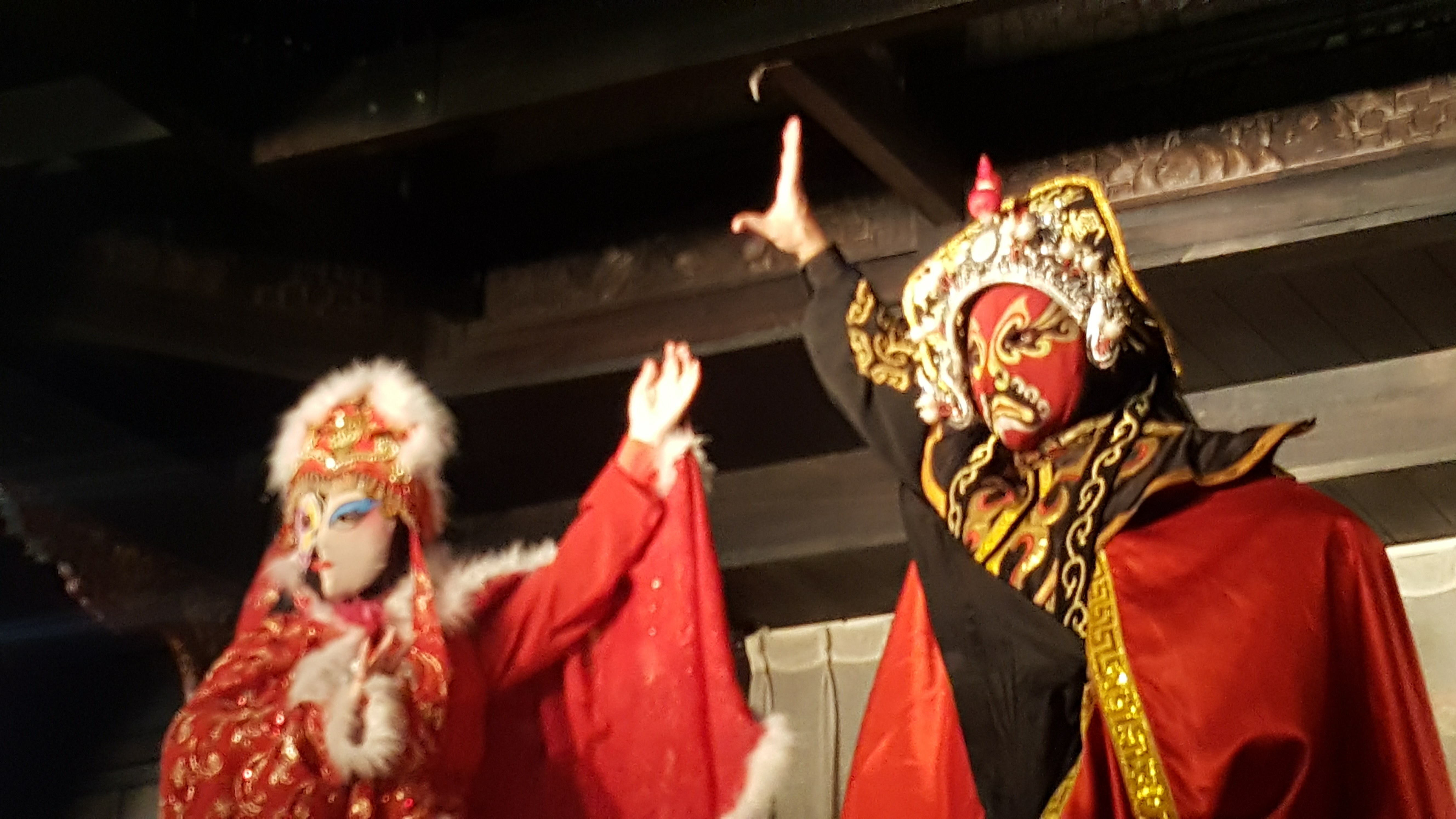 Numero 2: El Teatro del cambio de máscaras. Este tipo de teatro empezó hace 300 años durante el reinado de la dinastía Qing (entre 1736 y 1795) y las técnicas que usan para cambiar las máscaras son ultra secretas y han pasado de generación en generación. Es como magia ver cómo al mover el brazo de arriba a abajo, les cambia la máscara, o voltean la cara y es otra cara más! Dicen que en los inicios de este tipo de teatro usaban polvos de colores o pasta para hacer los efectos del maquillaje, luego usaban papel y así iban cambiando las caretas. Hoy las máscaras son de seda y tienen capas con hasta 24 cambios. Los artistas más talentosos pueden llegar a cambiar 10 veces de máscara en 20 segundos!!! El restaurante donde yo fui se llama Ba Guo Bu Yi y otra vez comimos muy picante, había un conejo entero en la mesa y …más arroz y bambús que fue lo que comimos la mayoría. El show estuvo increíble y nos regalaron un muñequito de recuerdo que puede jugar con los legos. Se los llevo de recuerdo.
