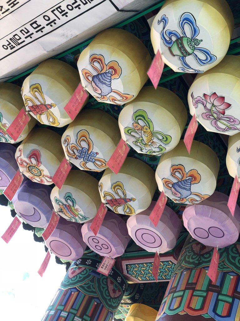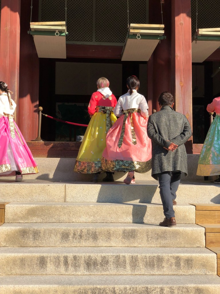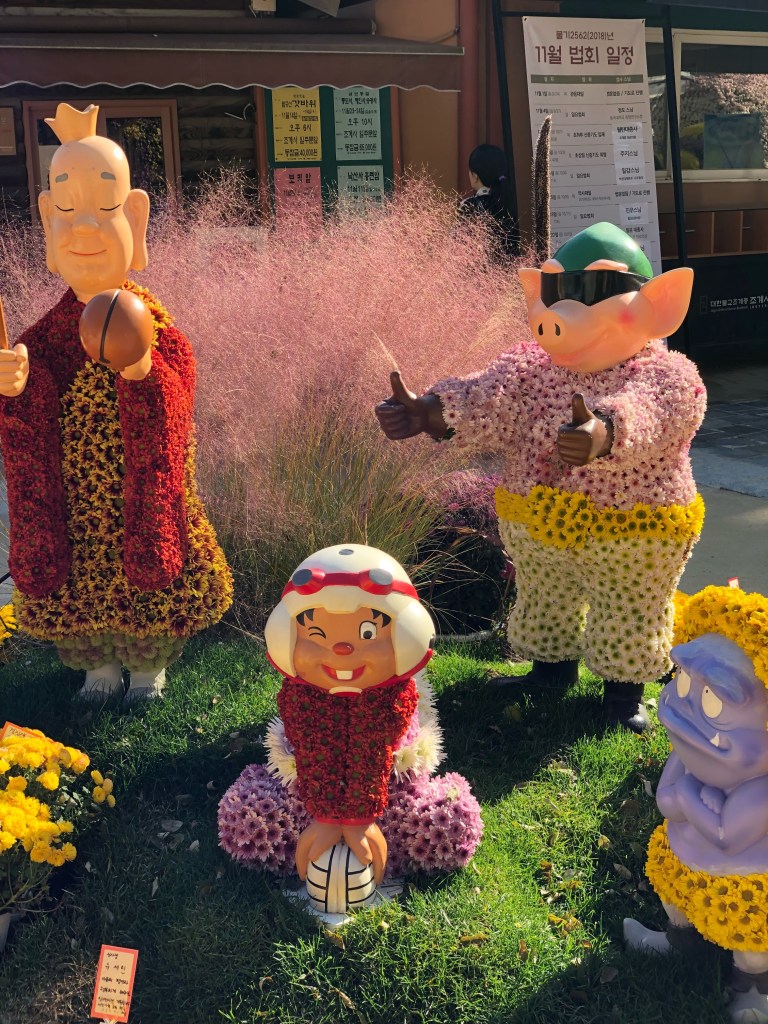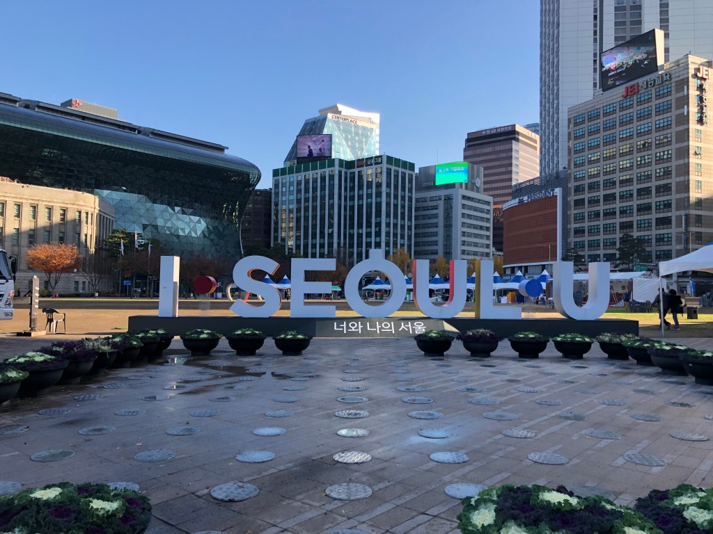 Me gustó mucho el contraste entre lugares históricos como el palacio Real de Gyeongbokngung (a ver si lo pueden pronunciar rápido!) y edificios modernos que son corporativos de Samsung, LG y otras compañías como Lotte. De lo clásico, el palacio Real Lo constuyeron durante la dinastía Joseon y después en 1910 fue parte del imperio Japonés hasta 1945. Hubieron varios templos que se destruyeron pero este tiene todavía varias celebraciones como bodas y votos. En noviembre hacen un festival de flores con crisantemos así que en varios lugares había arreglos muy coloridos e imponentes.