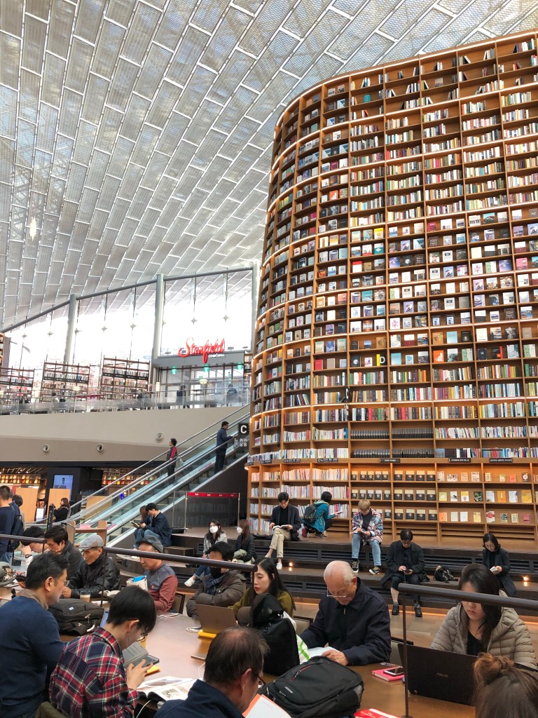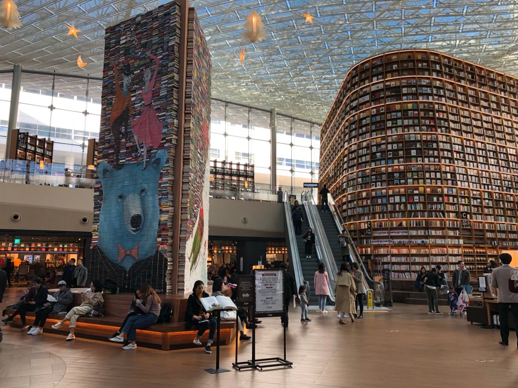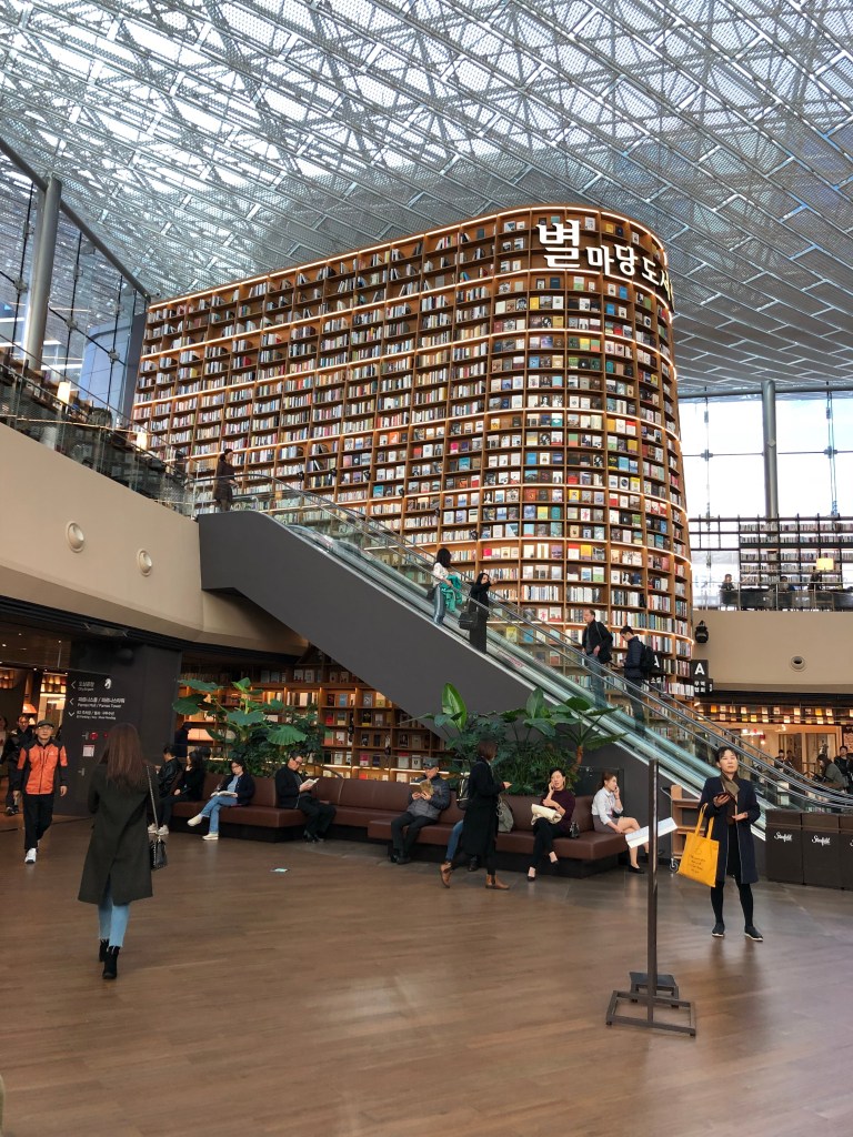 Y de lo moderno, pues aparte de que toda la ciudad es muy fácil de conocerla por el metro, todo está súper limpio y bien organizado. Pero, faltaba encontrar la biblioteca. Revisando mapas vi que estaba dentro de un centro comercial nada más y nada menos que en el distrito de Gangnam! Aún cuando hace tiempo que ya salió esa canción, siguen poniéndola en muchos lugares como retratando a la gente de esa zona de Corea. Pero, la verdad en las calles todos los jóvenes parecían como de grupos de K-POP.